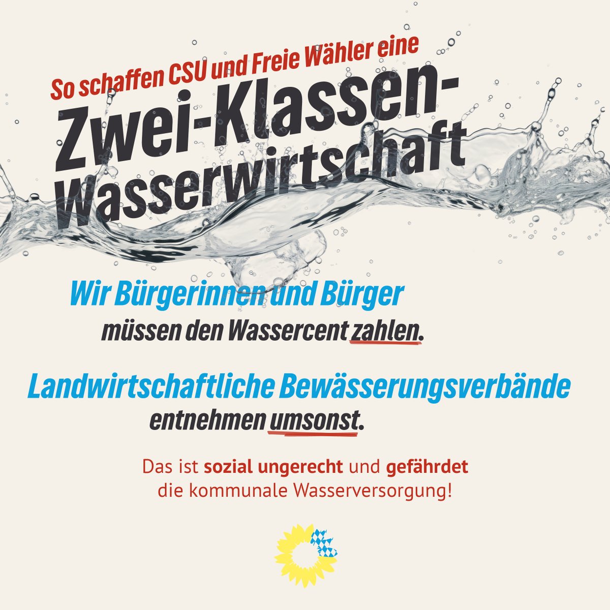 Mit gerade einmal 10 Cent pro 1.000 Liter soll der Wassercent dafür sorgen, mit dieser wertvollen ...Ressource sparsamer umzugehen. Aber die Staatsregierung schafft einen 2-Klassen-Zugriff auf etwas, das uns allen gehört. Wie soll so sozial gerechter Grundwasserschutz funktionieren?