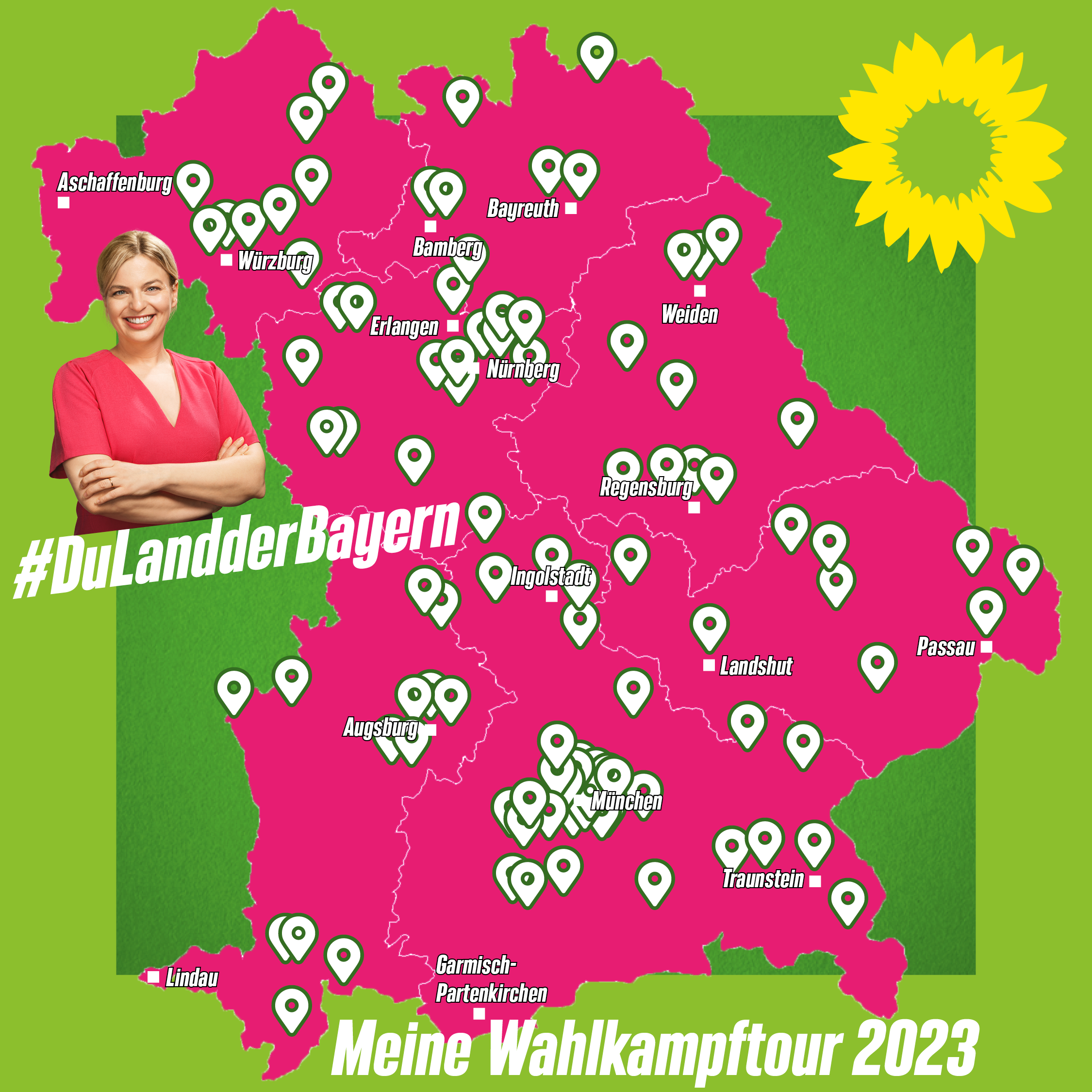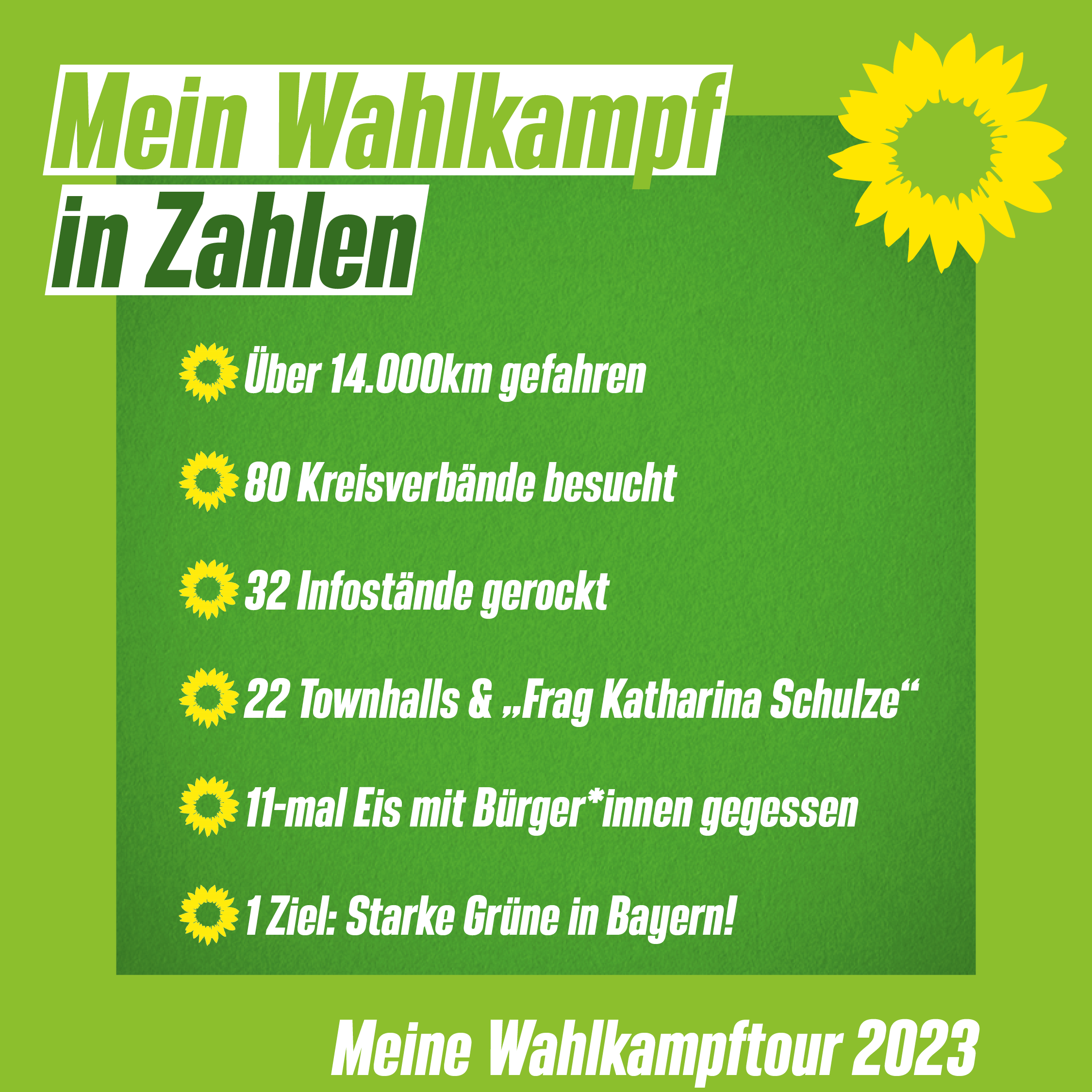 Vielen Dank an die 262.621 Wähler*innen im Stimmkreis Milbertshofen und im Wahlkreis Oberbayern, die mir bei der Landtagswahl ihre Stimme gegeben haben! Besonders freue ich mich darüber, dass ich wieder das Direktmandat in meinem Stimmkreis Milbertshofen gewinnen und über 20.000 Stimmen bezirksweit hinzugewinnen konnte. Es war ein intensiver, wechselhafter und anstrengender Wahlkampf. Trotz der negativen Nachrichten der vergangenen Wochen und Monate, hatte dieser Wahlkampf auch seine schönen Seiten: Tausende grüne Mitglieder auf den Straßen, an den Infoständen, auf den Marktplätzen, an den Haustüren und im Internet haben unseren Wahlkampf gerockt! Ich bin so dankbar dafür, für diese Partei und ihre wundervollen Mitglieder Spitzenkandidatin gewesen sein zu dürfen. Über 14.000 gefahrene Kilometer, 80 besuchte Kreisverbände, 32 gerockte Infostände, 22 Townhalls und „Frag Katharina Schulze“ sowie 11-mal Eis mit Bürger*innen gegessen habe ich in den letzten zwei Monaten erleben dürfen.
