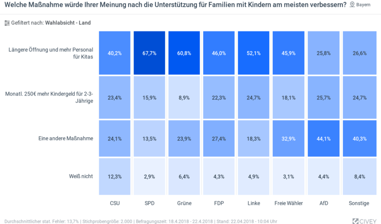 Flexiblere Kinderbetreuungszeiten wünschen sich laut Umfrage vor allem Menschen in dichter besiedelten Regionen – also in Bayerns Städten und Ballungsräumen. Hier das Umfrageergebnis aufgeteilt nach Parteien-Unterstützung: